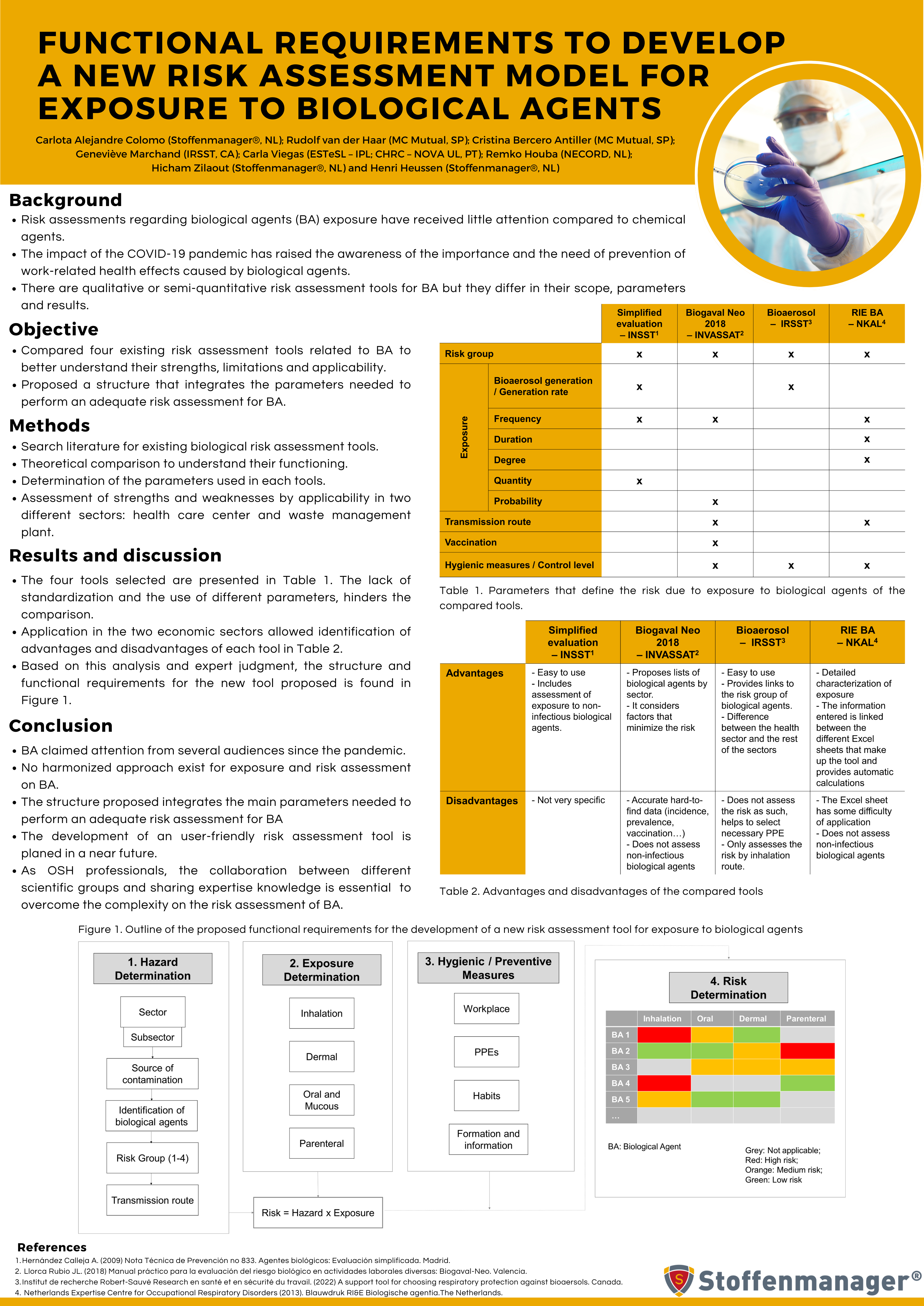 De poster werd goed ontvangen, maar de conferentie was niet echt gericht op biologische agentia. Dit is eigenlijk juist de reden waarom we zijn gegaan. We hebben nog veel werk voor de boeg om mensen bewust te maken van de risico's van blootstelling aan biologische agentia. Dit onderwerp blijft een soort blinde vlek. Gevaarlijke stoffen hebben altijd de meeste aandacht gekregen, maar er zijn nog andere elementen in ons midden die onze werk- en leefomgeving kunnen verstoren. Zoals we gezien hebben met de COVID-19 pandemie.